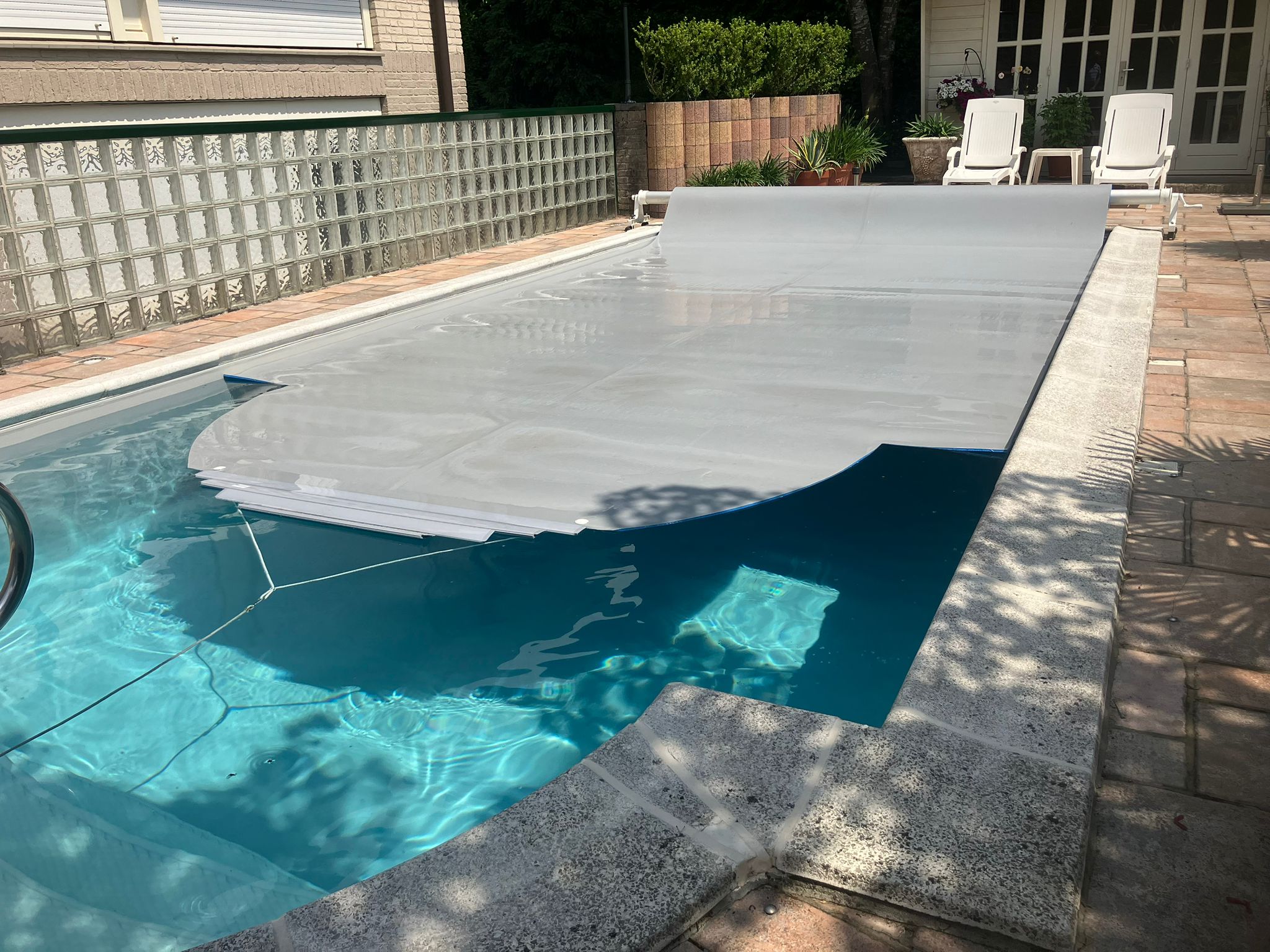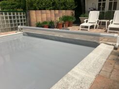 Grijze Liderpool foam cover die gedeeltelijk is uitgerold over een rechthoekig zwembad, gemonteerd op een oprolas voor isolatie en bescherming tegen vuil.